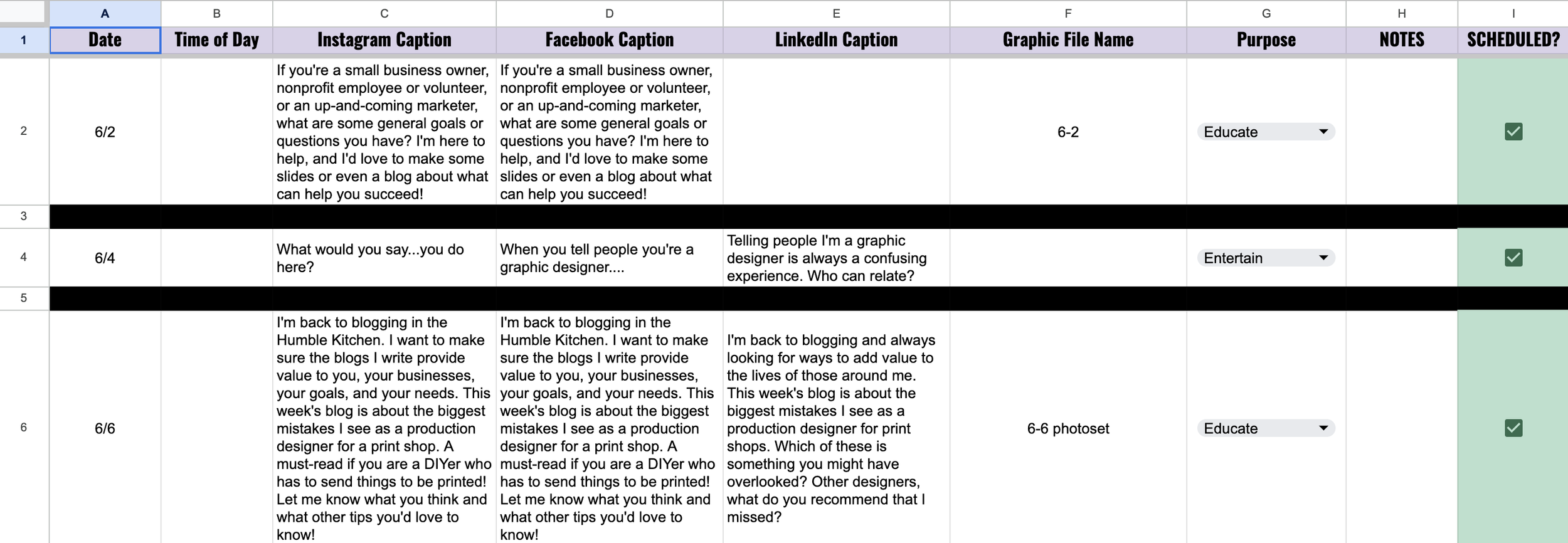 Having a content calendar allows you to get a bird’s eye view of when you’re posting, where, and what you’re saying or showing.