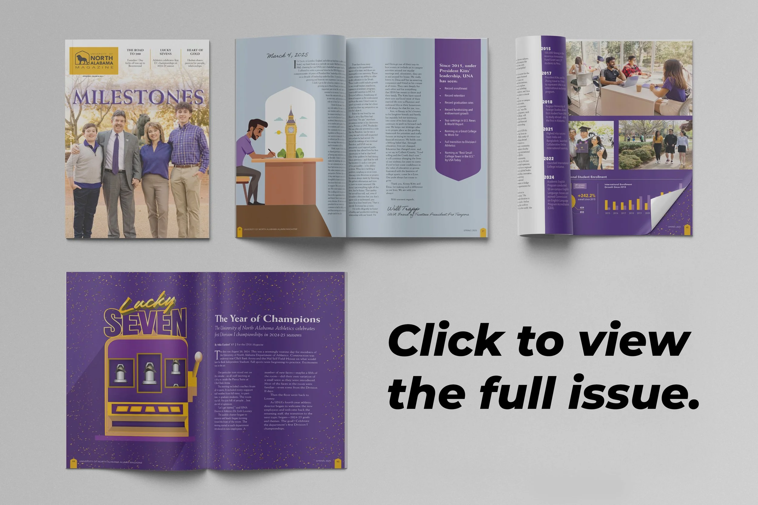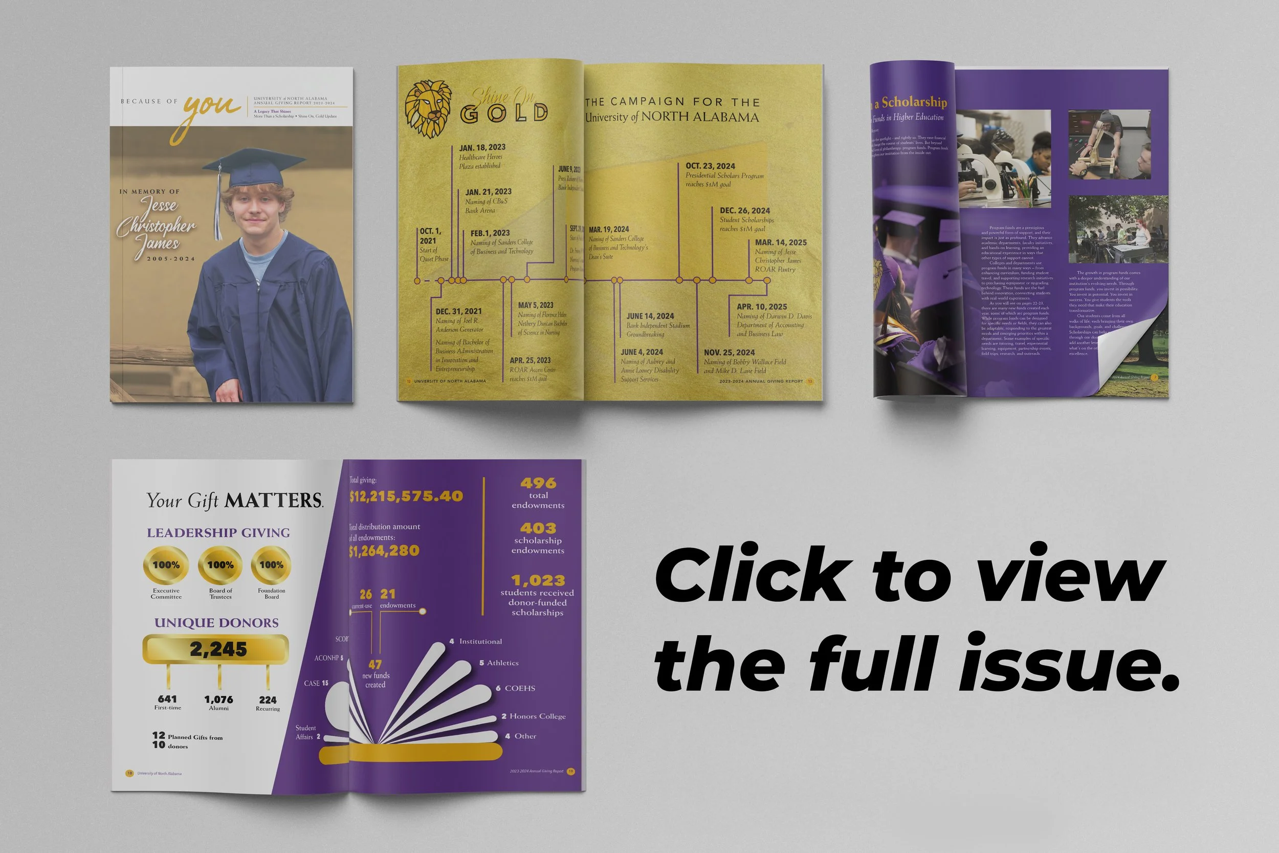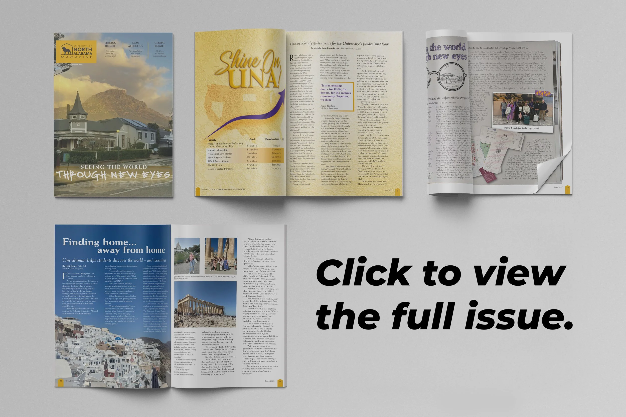 UNA Advancement connects alumni and donors to what’s happening on campus — and shows the real impact of giving — through their annual report and biannual magazines. When they needed someone to bring these stories to life visually (and sometimes in words), they turned to us for end-to-end design and creative support.